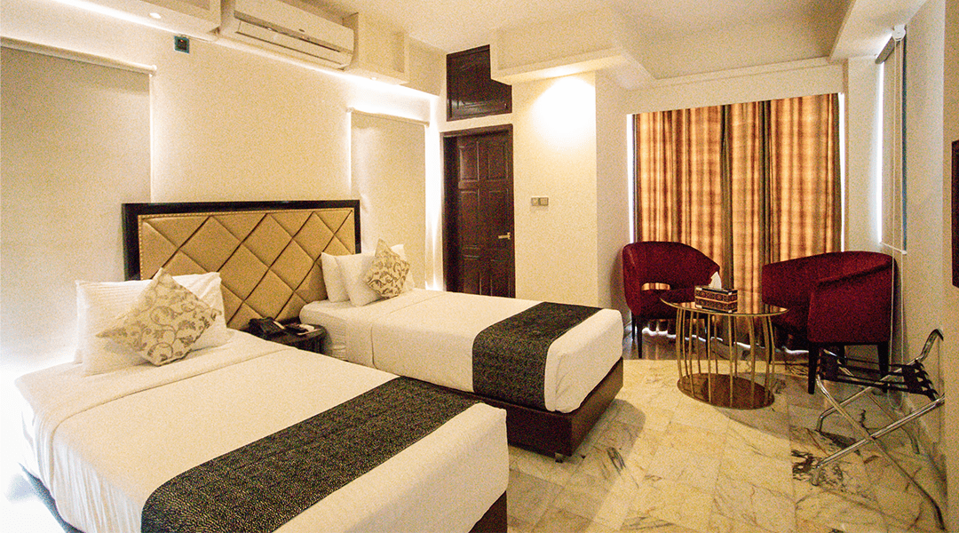 Our distinctive 350 square feet’s fully air-conditioned Deluxe Room is decorated with a two single Twin bed, LED TV in each room, Iron with ironing board, Electronic safety locker, and minibar. Our guests can enjoy free wireless internet facility. We present required amenities and value-added services which will enrich and uplift the experience of guests’ stay.